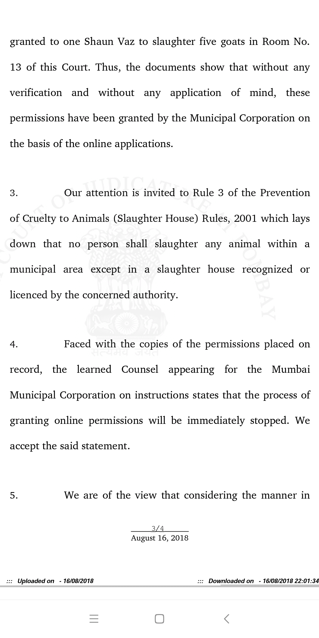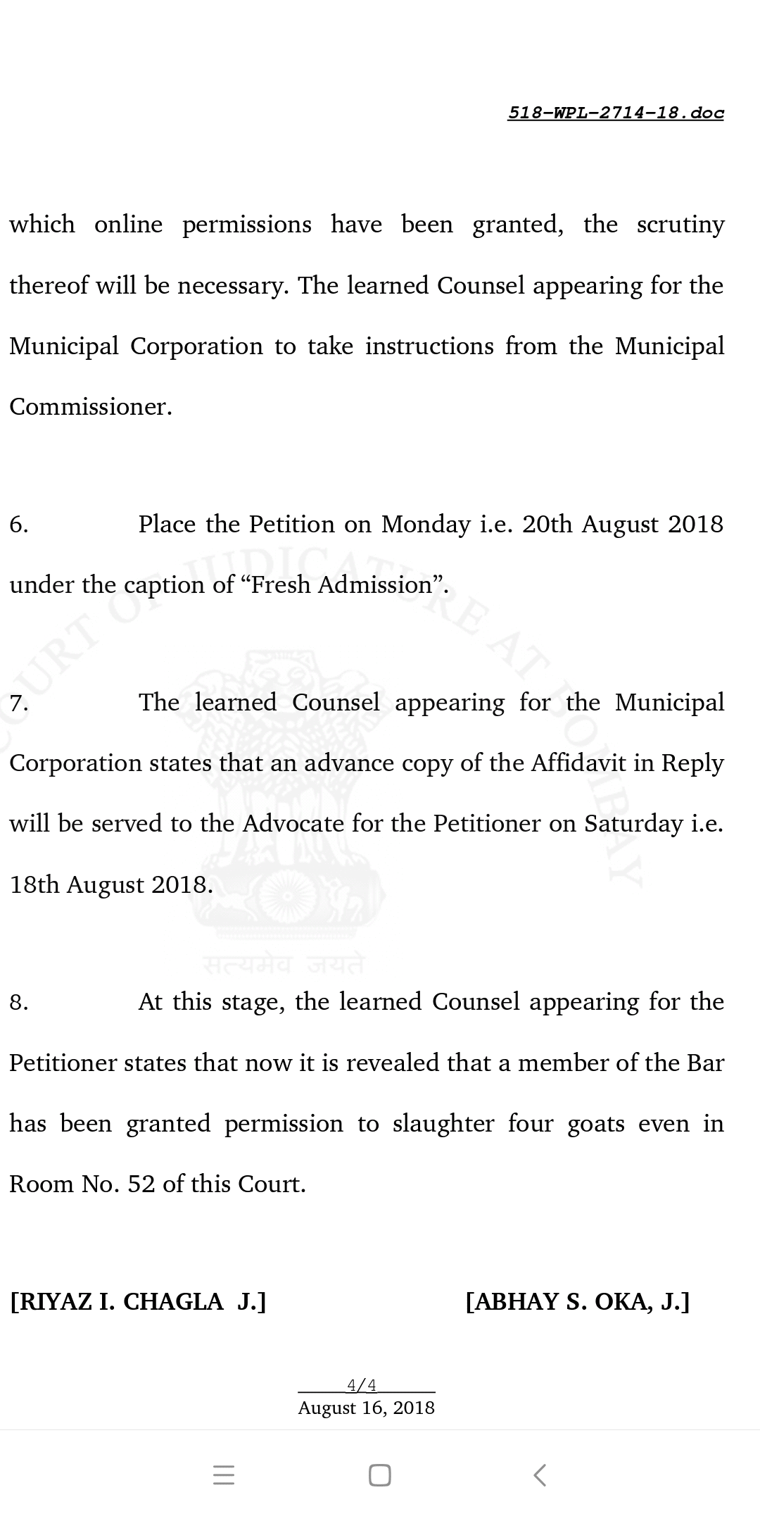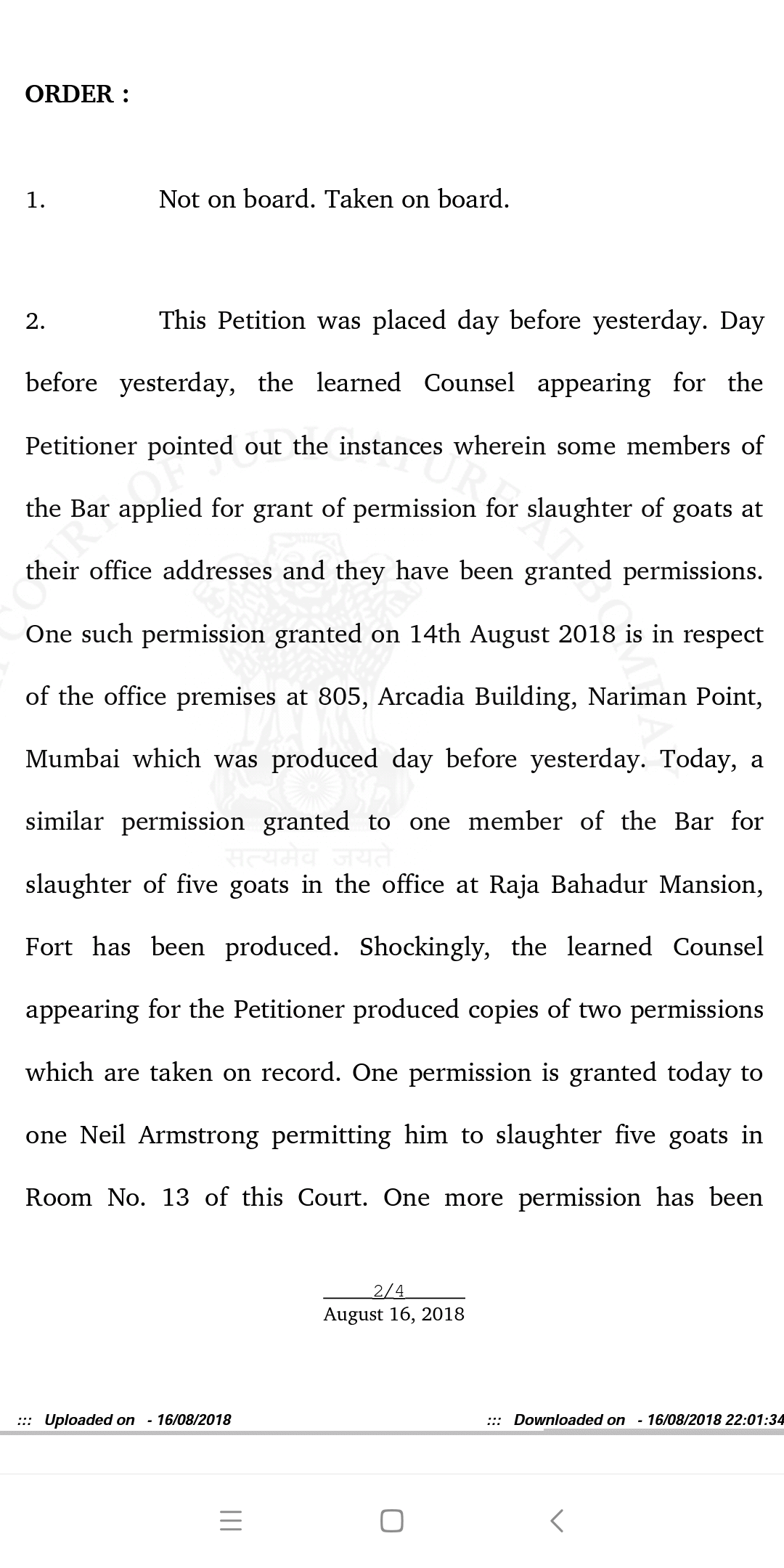 In a bizzarre manner BMC office has given permission on 14th August to slaughter 5 Goat’s to a person named Neil Armstrong in Room No 13 and a member of the Bar too was given a similar permission to slaughter goats in Room No.52 of the Bombay High Court, a petition has been filed in the court and evidences were kept in front of the Hon.Court bench of Justice Abhay Oka and Riyaz Changla.