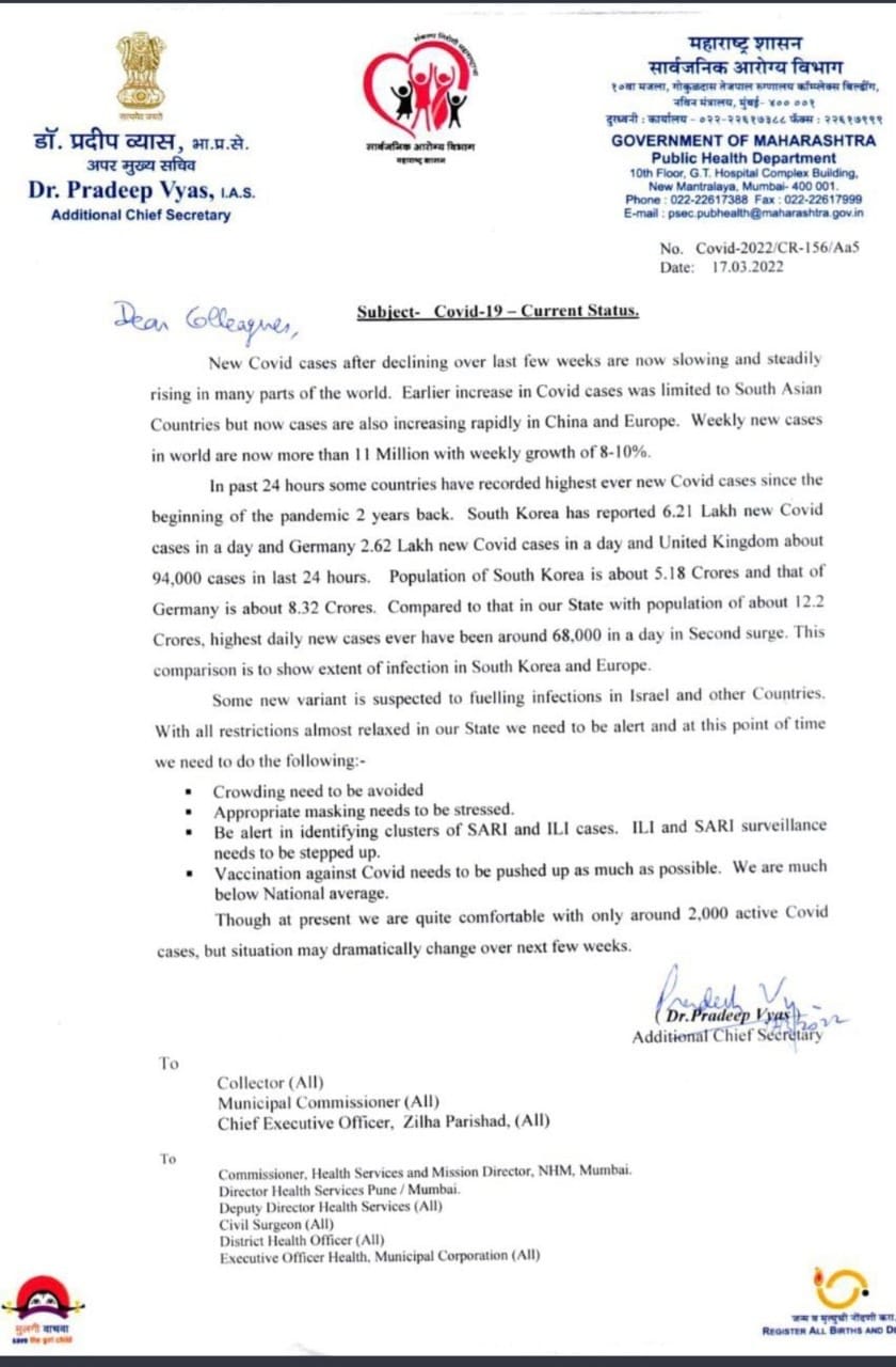 Central Government has issued an advisory to State’s regarding rise of Covid 19 cases across the world, following which Maharashtra Additional Health Secretary has issued an advisory to the State of Maharashtra.
