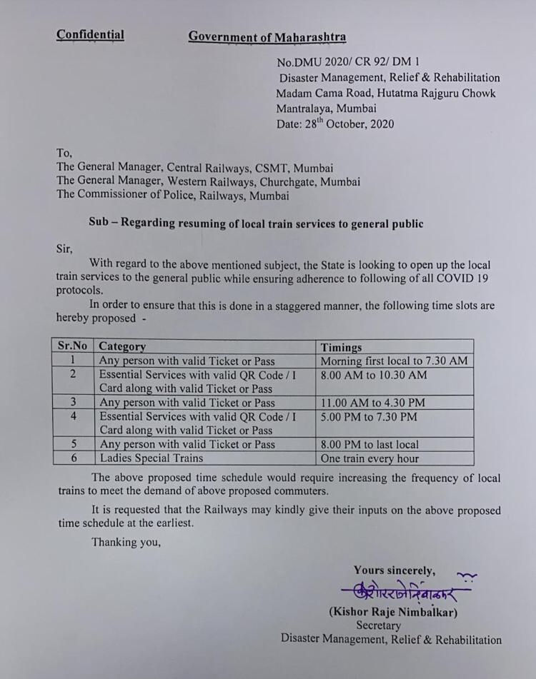 A letter No. DMU 2020 /CR 92 /DM 1 dated 28th October, 2020 is received today from Govt of Maharashtra regarding resuming of local train services for general public while ensuring adherence to all Covid19 protocols. In order to ensure this, several time slots have been proposed by the State Govt. and also request has been made to increase the frequency of local trains to meet the demand of proposed customers. State Govt. has also requested Railways to provide inputs on the proposed schedule. It is worth mentioning that currently, Railways are running 1410 special suburban services.